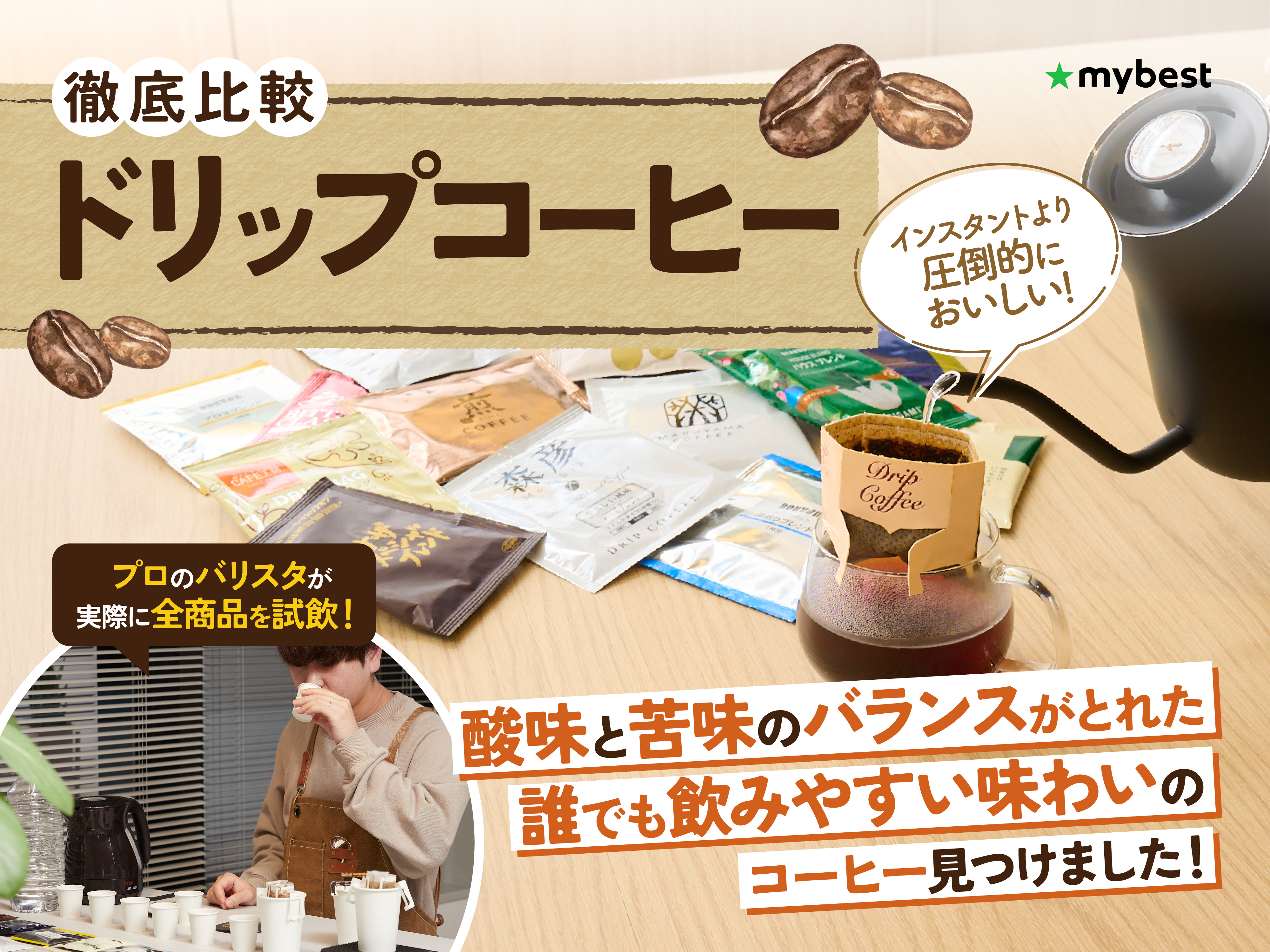 鋭意作成中 追加して欲しいコンテンツや要望・訂正などありましたら、お手数ですが、お問い合わせよりメールをお願い致します。 また「うちの情報を載せないで欲しい」という企業様・店舗様もご連絡をお願い致します。誠に申し訳ございません。 「mybest」のコーヒー情報まとめ ~飲料~ mybest 2025.01.242025.01.30 目次 コーヒー豆ファストコーヒーインスタント・ドリップコーヒー缶・ペットボトルコーヒーカフェインレスその他コーヒー食品 コーヒー豆 【徹底比較】コーヒー豆のおすすめ人気ランキング【おいしいのは?2026年2月】スターバックス・UCC・ブルーボトルとたくさんのメーカーから販売されているコーヒー豆。しかし、「自分好みの味わいが楽しめるコーヒー豆はどれ?」「よく聞くブランドのコーヒー豆は本当においしいの?」と悩む場面もありますよね。 実はコーヒー豆には... フレーバーコーヒーのおすすめ人気ランキング【2026年3月】ヘーゼルナッツやバニラなどのフレーバーが楽しめる、フレーバーコーヒー。甘い香りからスパイシーなものまでバリエーションが豊富で、気分に合わせてぴったりのフレーバーを選べるのが魅力です。しかし、味わいやいれ方には多くの種類があるため、どれを選ぶ... カフェインレスコーヒー豆のおすすめ人気ランキング【2026年3月】カフェインの摂取を抑えながらコーヒーを楽しめる、カフェインレスコーヒー豆。 通常のコーヒーと変わらないほど味や香りがよいものも増えており、以前よりもカフェインレスのものを選ぶ人が増えています。多くのメーカーから、さまざまな商品が発売中です。... アイスコーヒー用コーヒー豆のおすすめ人気ランキング【2026年3月】暑い季節に飲みたくなるのが、冷たくておいしいアイスコーヒー。アイスコーヒー用のコーヒー豆を使えば、自宅でもお店で飲むような味わいが楽しめます。しかしいざ選ぼうとすると、産地や焙煎度合い、挽き方などがさまざまで、どれを選ぼうか迷ってしまいます... 【徹底比較】水出しコーヒーのおすすめ人気ランキング【2026年1月】すっきりマイルドな味わいが魅力の水出しコーヒー。コールドブリューコーヒーとも呼ばれ、麦茶のようにバッグを水に浸けておくだけで手軽に飲めるのが魅力です。しかし、キーコーヒー・澤井珈琲・カルディ・UCCといったメーカーから多くの商品が販売されて... 【徹底比較】コーヒー粉のおすすめ人気ランキング【2026年3月】豆を挽く手間がなく、手軽においしいコーヒーを楽しめる「コーヒー粉」。すでに挽かれているので、そのままコーヒーを抽出できます。しかし、商品ごとに挽き目や焙煎度合いが違い、味わいもさまざま。また、スタバ・UCC・タリーズコーヒーなど、メーカーや... 高級なコーヒー豆のおすすめ人気ランキング【2026年3月】高級なコーヒー豆は、ギフトや自分へのご褒美にぴったりです。しかし豆の種類は華やかな香りのパナマ・ゲイシャや、動物のフンを使ったブラックアイボリーなどさまざまで、産地もエチオピア・インドネシアなど豊富。高品質なスペシャルティコーヒーも多く、ど... コーヒーのサブスクのおすすめ【2026年1月】定額料金で、コンスタントに自宅や職場に届く「コーヒーのサブスク」。手間がかからず、カフェに行くより安い価格で本格コーヒーが楽しめます。とはいえ、届くコーヒーには豆・パウダー・カプセルなどの違いがあり、種類・料金・量・配達頻度もさまざまなので... ファストコーヒー 【ファストコーヒー頂上決戦】バリスタが本気で飲み比べしてみた!1位はまさかのあのコンビニ...!【ホットコーヒー編】寒い日こそ飲みたくなるホットコーヒー。そんなときによくお世話になるのが、安くて手軽に買えるコンビニエンスストアやファストフード店のホットコーヒーですよね。価格は100円台からと手軽で、近年確実においしさのクオリティも上がってきています。そこ... 【アイスカフェラテ頂上決戦】バリスタが本気で飲み比べ!違いがあったのはコーヒーだけじゃない?【2024年夏】前回ファストコーヒー頂上決戦と題し、コンビニエンスストア各社を中心にアイスコーヒーの飲み比べを行いました。飲み比べの内容はおもしろく、各社味わいの特徴があり違いもはっきりと感じる結果に。では「アイスカフェラテ」ではどうなのでしょうか。正直コ... 【セブン】産地が選べる?新作アイスコーヒーの実力をバリスタが検証してみた!【ファストコーヒー頂上決戦延長戦】前回のファストコーヒー飲み比べでも最後に触れていた、セブンイレブンの新しいファストコーヒー。その名も「選べる産地ブレンド」。6月末から都内の一部店舗で展開されており、マシンで3種類の産地別のブレンドから好みの味わいを選択できます。コンビニの... 【ファストコーヒー頂上決戦】バリスタが本気で飲み比べしてみた!1位はセブンではなくまさかの...!【2024年アイスコーヒー編】近年100円台のコーヒーがいろいろなお店で購入できる